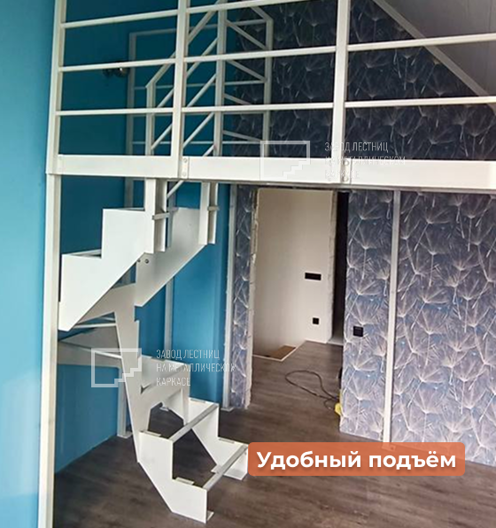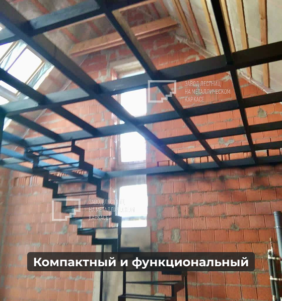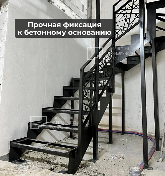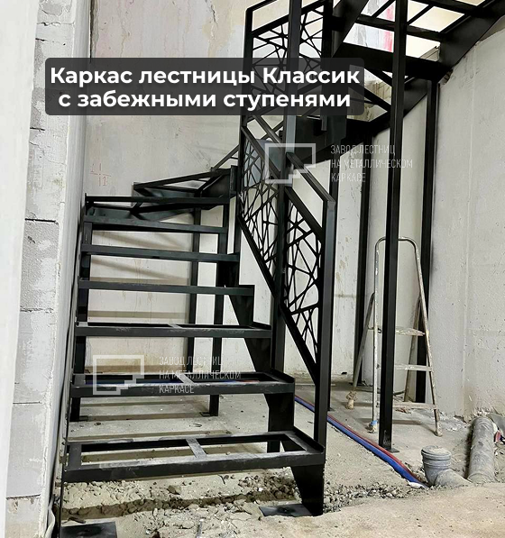 🔩 Каркас лестницы «Классик» с забежными ступенями Лестничный марш выполнен по проекту «Классик» с поворотом на 90° и забежными ступенями — это позволяет компактно разместить конструкцию даже в ограниченном пространстве.