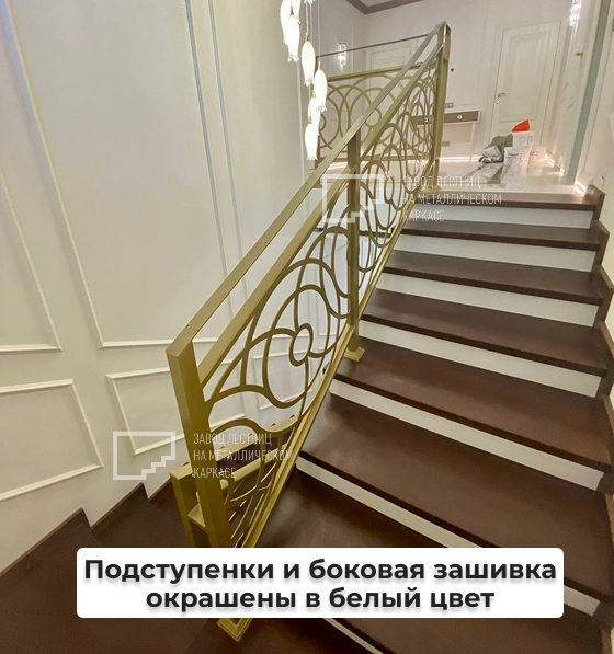 🟢 Подступенки и боковая зашивка окрашены в белый цвет, визуально “облегчая” лестницу и создавая чистый контраст с темными ступенями.