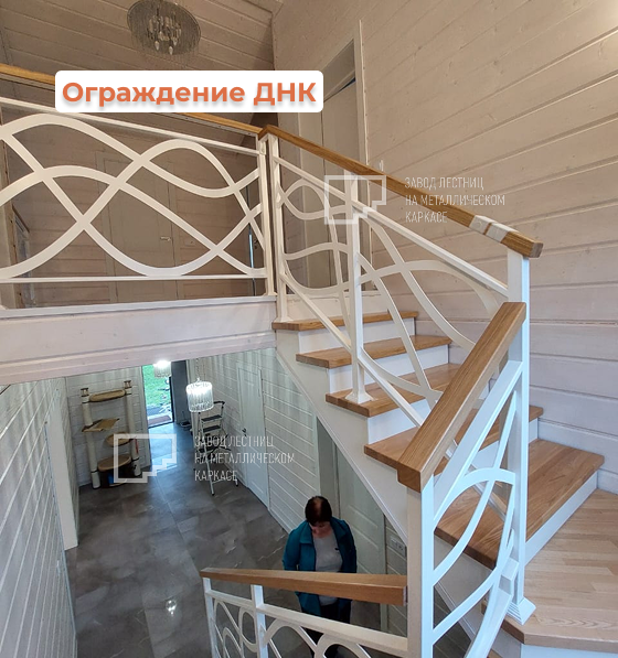 На втором этаже установлено ограждение в той же модели «ДНК», что создает единый гармоничный облик интерьера и повышает безопасность.