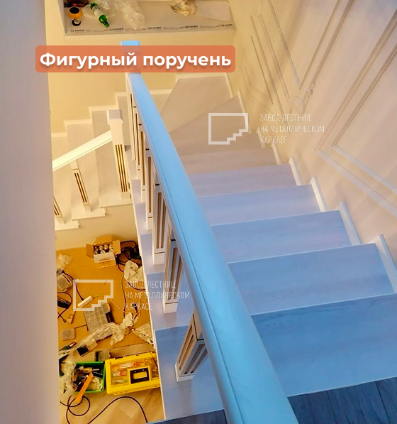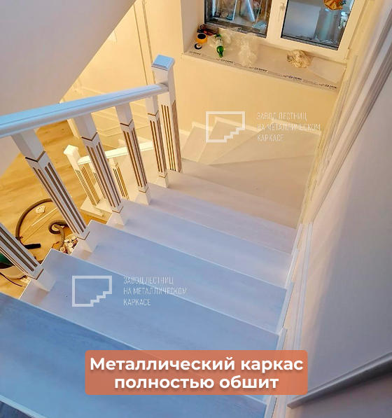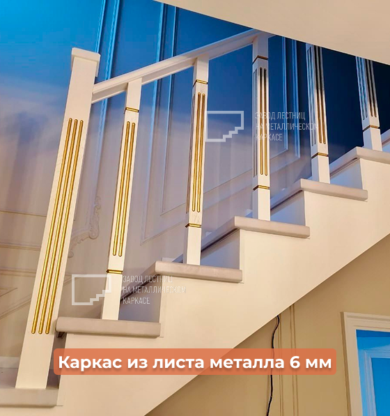 ✔️ Фальшкосоур выполнен из МДФ — технологичного и стабильного материала, который мы красим в нужный цвет. В данном проекте фальшкосоур окрашен в белый, идентичный ступеням, создавая визуальную цельность конструкции.