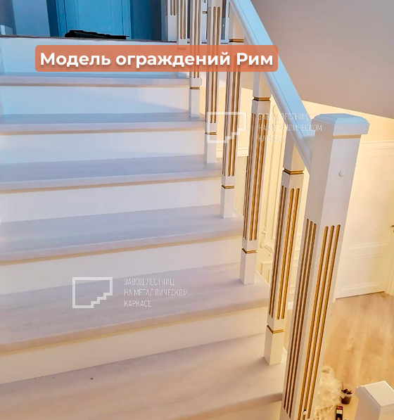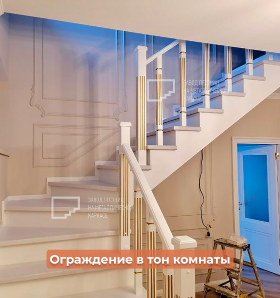 Клиент хотел видеть лестницу белого цвета с золотыми акцентами, выполненную из натурального дерева, с плавным подъемом и красивым ограждением. Также рассматривался вариант установки пригласительных ступеней — одной, двух или даже трёх — для придания лестнице большей солидности и декоративности.