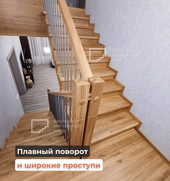Плавный поворот и широкие проступи — удобно подниматься и спускаться даже с ребёнком на руках 👶