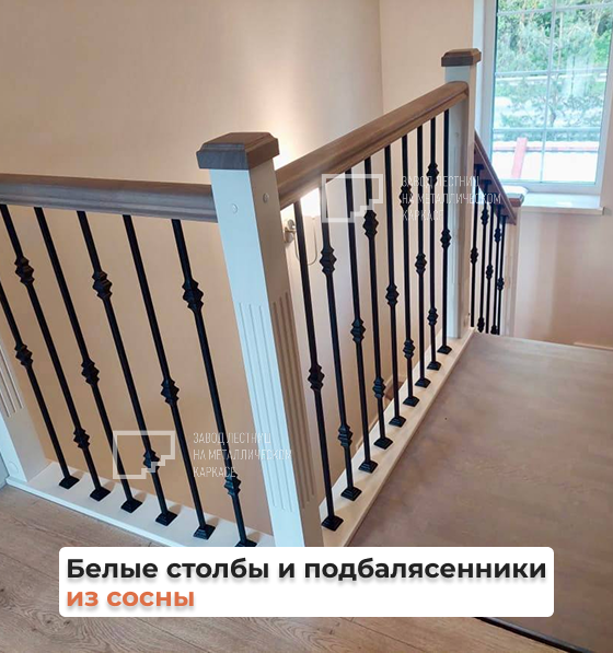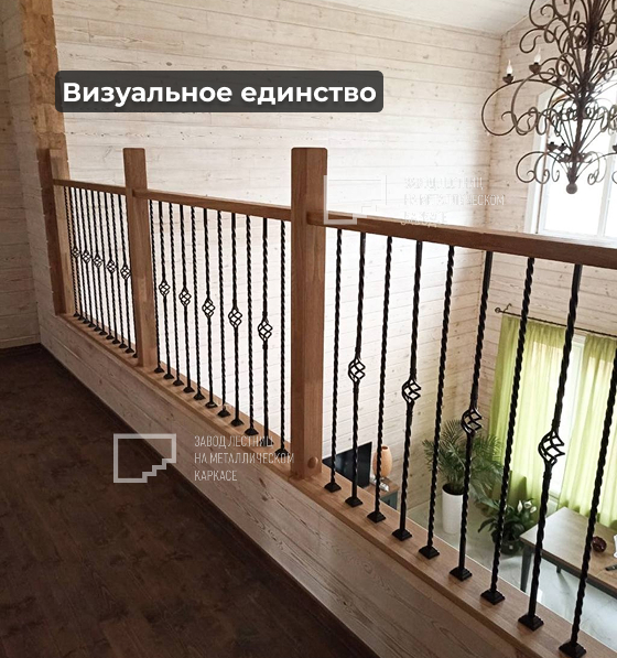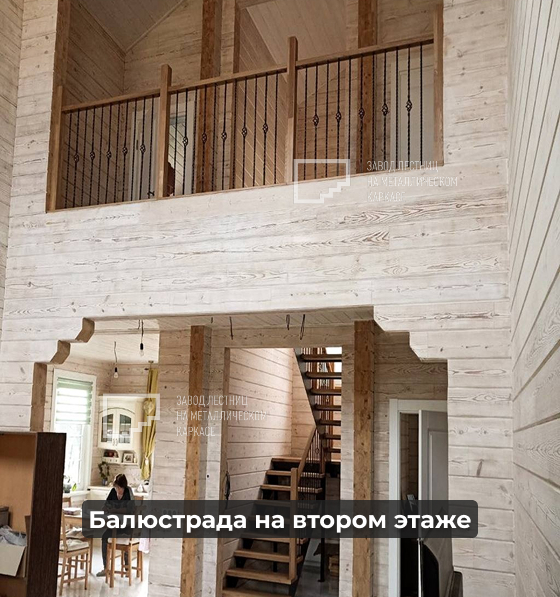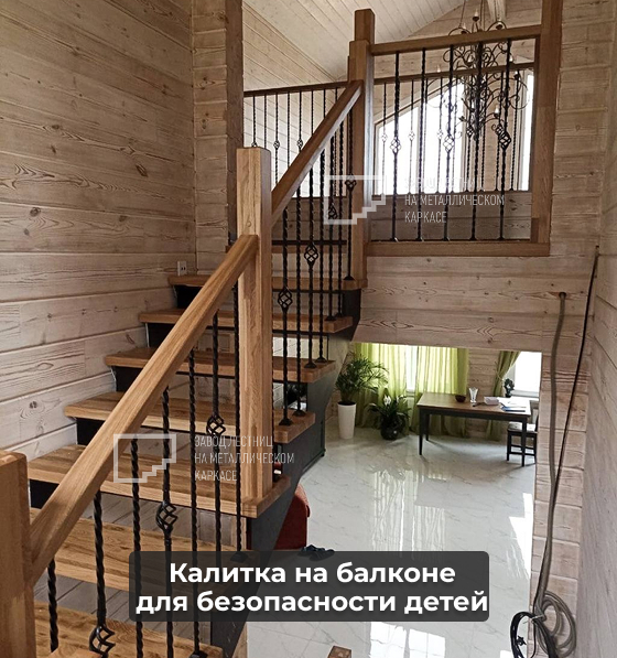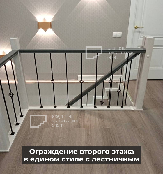 Согласованный стиль ограждений на лестнице и на втором этаже, включая калитку на балконе для безопасности детей.