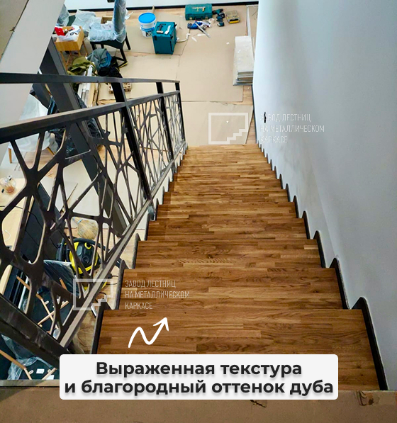 Ступени изготовлены из натурального дуба — твёрдой породы древесины, которая идеально подходит для лестниц: