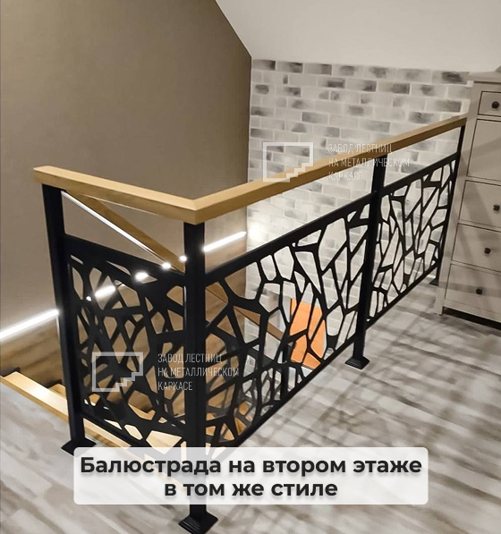 📌 Запрос клиента: Заказчик обратился с задачей спроектировать компактную лестницу для частного дома, которая не загромождала бы пространство, была максимально прочной и при этом визуально вписывалась в современный интерьер. Важным пожеланием стало использование декоративного ограждения в стиле «Леопард» — чтобы оно присутствовало как на самой лестнице, так и на втором этаже, создавая единую композицию.