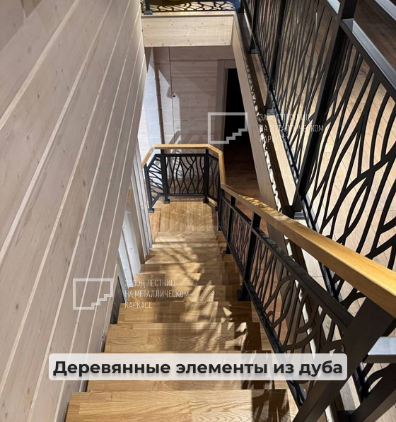 В качестве основного материала для ступеней мы использовали дуб 🌳 — современный и практичный материал, который прекрасно подходит для лестниц. Его гладкая поверхность позволила создать элегантный и долговечный дизайн.