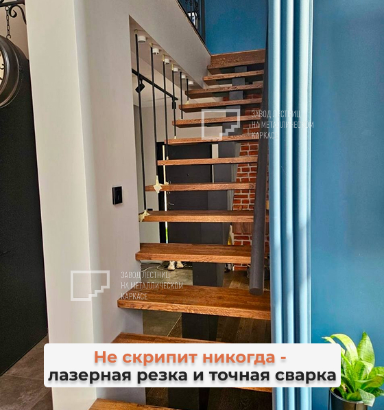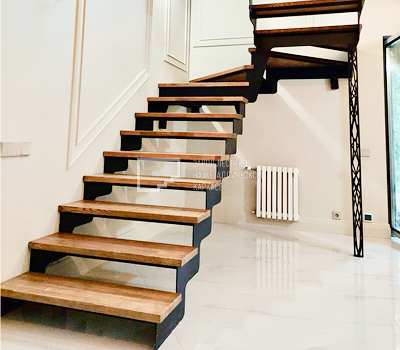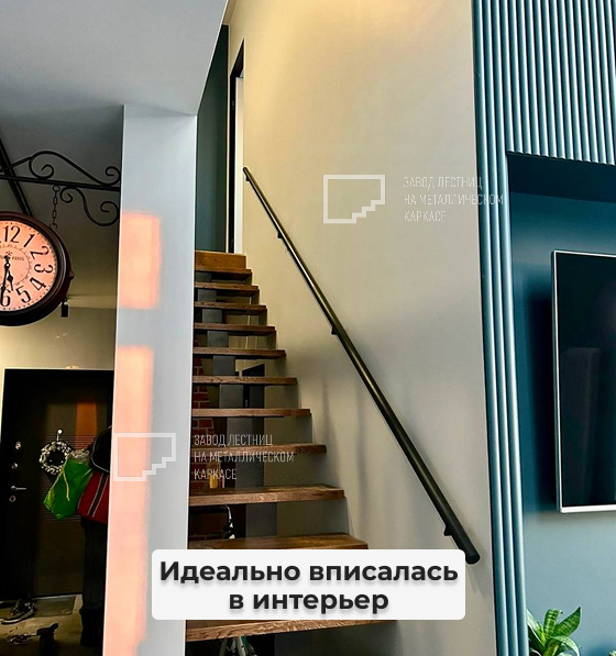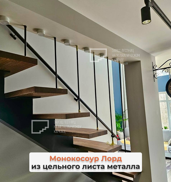 Мы предложили оптимальное и проверенное временем решение — лестницу на монокосоуре «Лорд». Эта модель идеально подходит для узких проёмов и небольших помещений. Косоур изготовлен индивидуально из цельного листа металла, обеспечивающего высокую прочность при визуальной лёгкости конструкции.