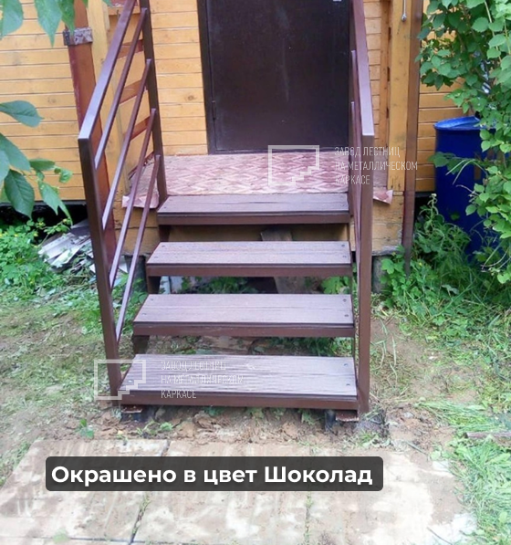 Перед монтажом лестницы были установлены винтовые сваи заранее. Верх лестницы крепили в торец дома большими саморезами.