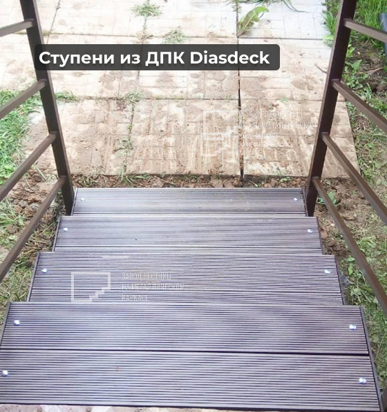 Установлены из ДПК-доски Diasdeck (древесно-полимерный композит). Это долговечный, влагостойкий и антискользящий материал, идеально подходящий для уличных условий.