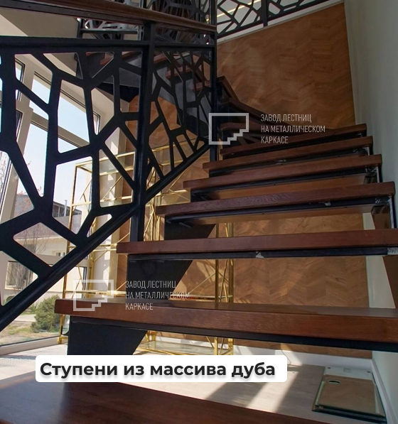😍Ограждение на втором этаже: выполнено в едином стиле с лестничным — с тем же геометрическим рисунком и из того же цельного стального листа толщиной 4 мм, вырезанного на высокоточном лазерном оборудовании немецкого производства. Это не просто продолжение лестницы, а часть общего дизайнерского решения, которое придаёт интерьеру завершённость и визуальную целостность. Металлическое ограждение надёжно закреплено к полу, соответствует всем требованиям безопасности, и, благодаря заводской покраске, обладает высокой устойчивостью к царапинам и коррозии. Дубовые поручни на ограждении второго этажа перекликаются с лестничными, создавая единый стиль и приятную тактильность по всей длине конструкции.