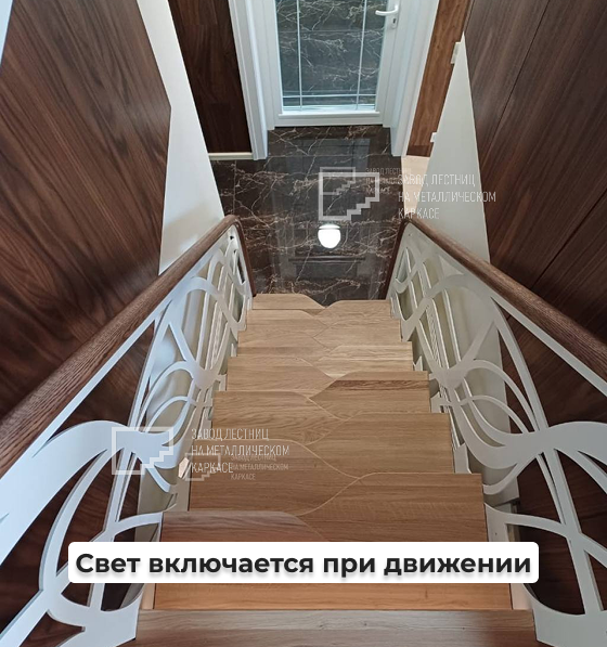 💡 Подсветка: Это не просто декор, а полностью автоматизированная система — свет включается при движении, обеспечивая безопасность и подчёркивая пластику линий.