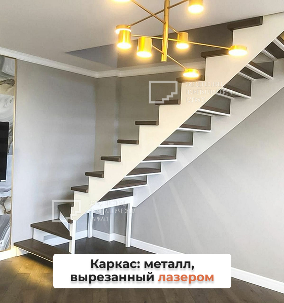 Основа лестницы — металлический каркас из листа стали толщиной 6 мм «Классик». Чтобы он служил десятилетиями и идеально вписался в проект, мы вырезали его на немецком лазерном станке — это оборудование промышленного класса с ювелирной точностью до 0,1 мм.