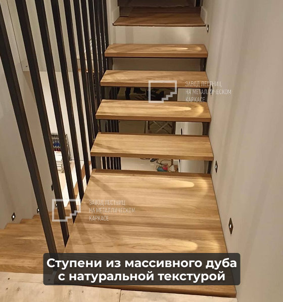 Ступени выполнены из массивного дуба с натуральной текстурой. Поверхность тщательно отшлифована и покрыта износостойким лаком. Фаска по краям делает ступень безопасной и приятной на ощупь. Ширина ступеней подобрана с учётом комфортного шага, а глубина — с расчётом на ежедневное использование.