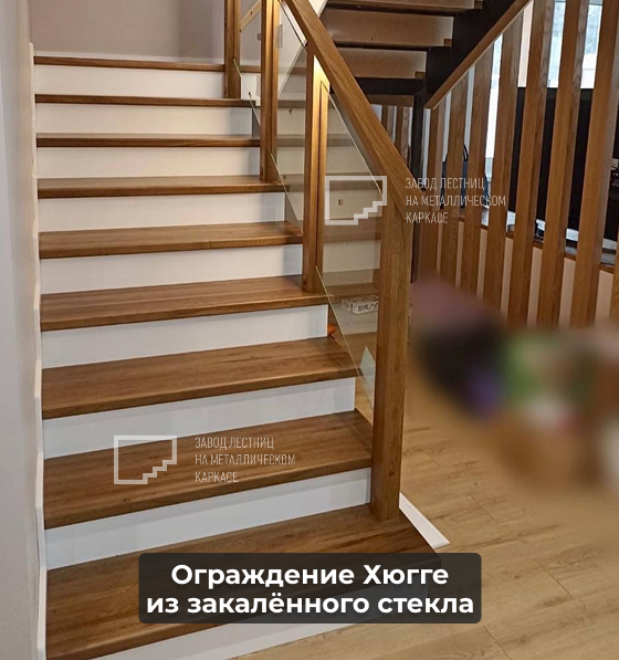 Ограждение «Хюгге» выполнено из закалённого стекла в сочетании с дубовыми стойками и поручнем.