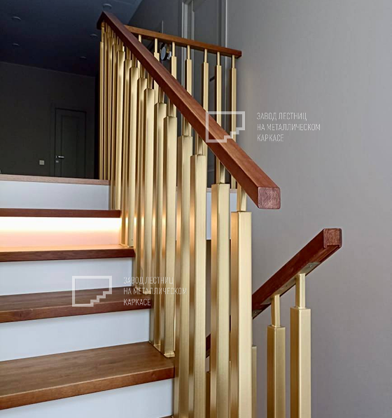 Ограждение выполнено из металла, окрашенного на заводе в золотистый цвет. Использована заводская покраска, обеспечивающая стойкость к царапинам, влаге и времени. Такое решение не только практично, но и добавляет акцент в интерьер.