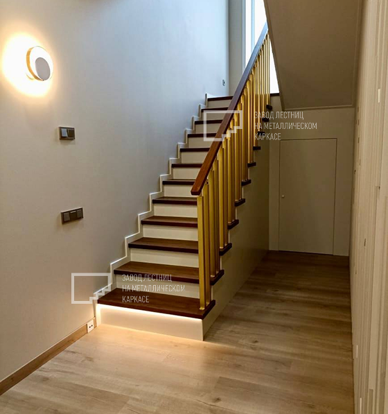Мы встроили светодиодную подсветку в ступени. Она выполняет не только декоративную функцию, но и делает передвижение по лестнице в темноте безопасным. Подсветка может быть теплой, нейтральной или цветной (RGB) с возможностью управления через пульт или приложение. Это добавляет уюта и создаёт нужную атмосферу в зависимости от времени суток и настроения.