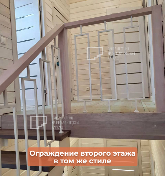 Ограждение на втором этаже выполнено в том же стиле, что и лестничное, обеспечивая единый облик интерьера.