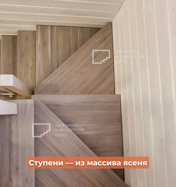 Ступени — выполнены из массива ясеня, цвет — светло-серый, с сохранением текстуры дерева. Ясень отличается прочностью, устойчив к износу и отлично подходит для лестниц в частных домах