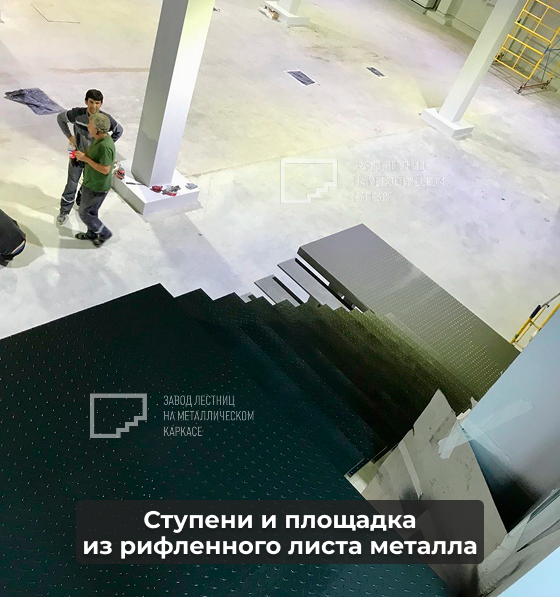 Ступени и промежуточная площадка выполнены из рифлёного металлического листа с насечкой, что значительно повышает безопасность использования: