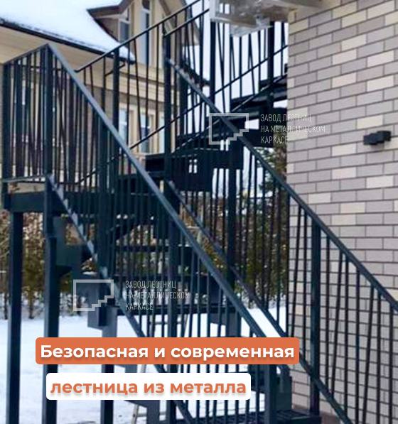 «Нужна уличная металлическая лестница с площадкой для выхода со второго этажа здания столовой на территории небольшого административного корпуса промпредприятия. Основные требования: антикоррозийная защита, устойчивость к снегу и влаге, пожарная безопасность, удобство эксплуатации в зимний период. Важно, чтобы конструкция была максимально прочной, с долговечными ступенями и надежным ограждением.»