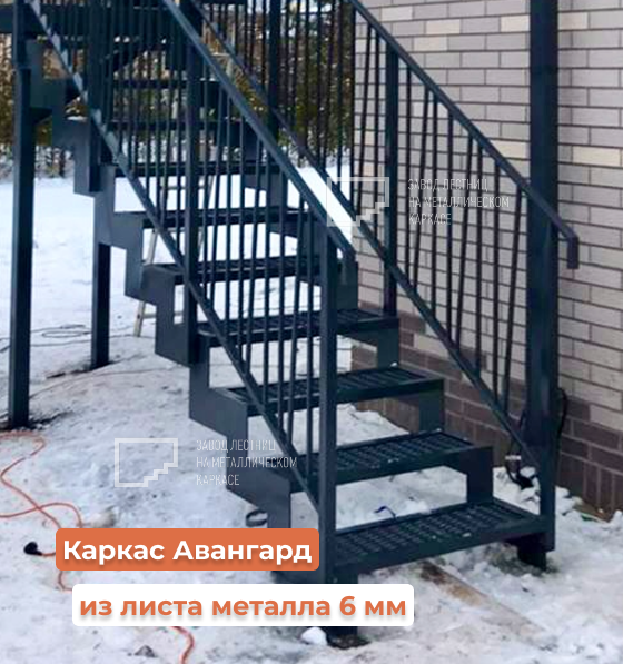 Для заказчика была изготовлена и смонтирована наружная лестничная конструкция с двумя маршами, соединёнными промежуточной площадкой. Основной каркас выполнен из листового металла Авангард — это материал, зарекомендовавший себя на промышленных и гражданских объектах благодаря высокой несущей способности, стойкости к коррозии и морозоустойчивости. Лестница фиксируется на надёжных опорах и крепится к стене здания, выдерживая постоянные климатические нагрузки и механическое воздействие.