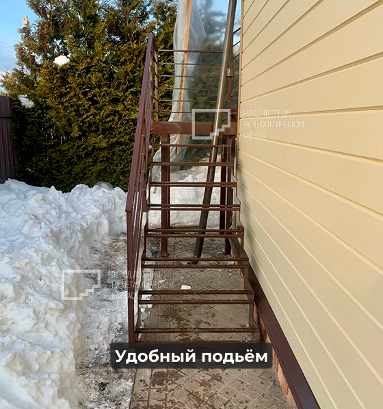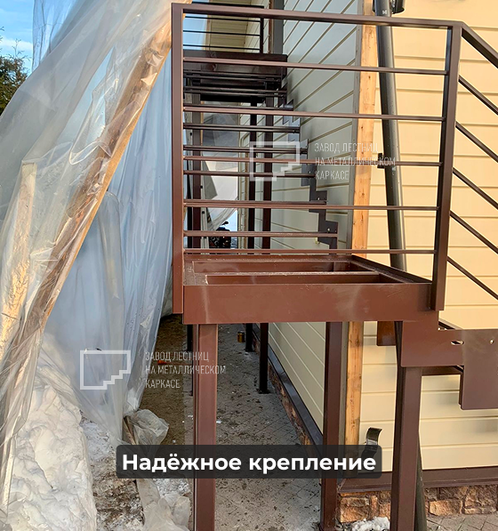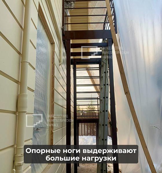 Надежные крепления: лестница закреплена к фасаду и имеет собственные опорные ноги, которые принимают на себя основную нагрузку.