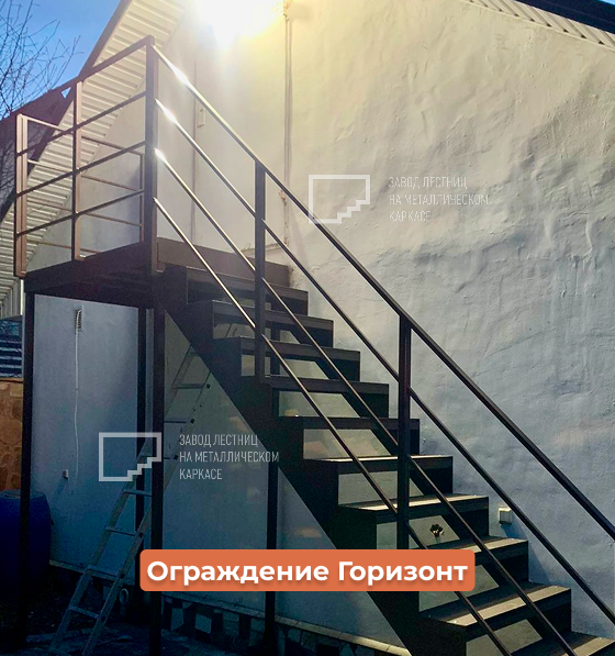 Для лестницы использовался высококачественный конструкционный металл с антикоррозийным покрытием. Каркас выполнен из прочного листа металла, ступени – из решетчатого профнастила, который предотвращает скольжение, что особенно важно для эвакуационных лестниц. Ограждения «Горизонт» изготовлены из металлической трубы с прочными горизонтальными перемычками для максимальной безопасности.