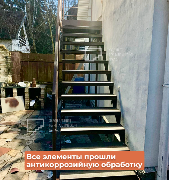 После изготовления все элементы были доставлены на объект. Монтаж проводился поэтапно: сначала установили опорные стойки и закрепили их к основанию анкерными болтами, затем смонтировали марш лестницы, площадку и ограждения. Все узлы были проверены на прочность и надёжность креплений. Завершающим этапом стало покрытие всех сварных швов защитным составом и финальная покраска.