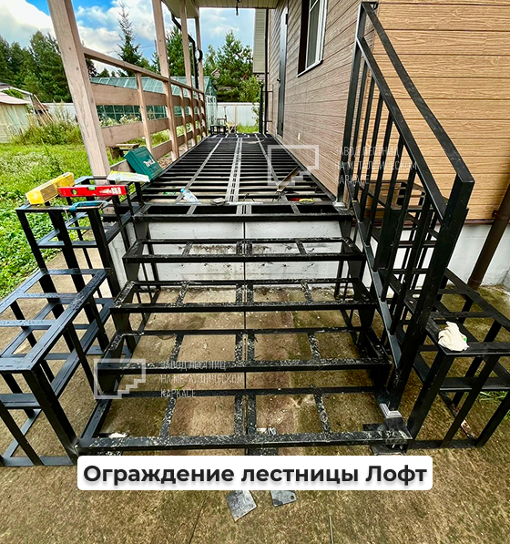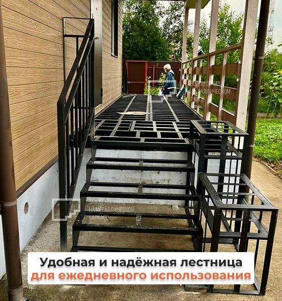 Лестница также выполнена на металлическом каркасе, что делает её прочной, устойчивой и максимально долговечной. Такой тип лестницы отлично подходит для уличных условий и не боится влаги, перепадов температур и сезонных нагрузок. При этом лестницу, как и саму террасу, можно в дальнейшем легко обшить деревом или террасной доской, сохранив единую стилистику с настилом.