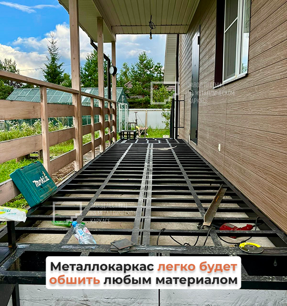 Особое внимание было уделено геометрии и жёсткости. Каркас выполнен с точной привязкой к дому, с правильными шагами лаг и усилениями в местах повышенной нагрузки. Это обеспечивает ровную поверхность настила, отсутствие прогибов и стабильность конструкции даже при активной эксплуатации. Металл обработан и подготовлен под дальнейшую отделку, что значительно упрощает последующие этапы работ.