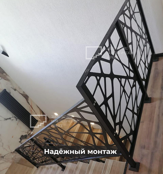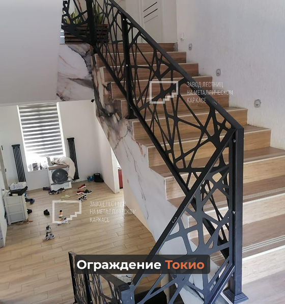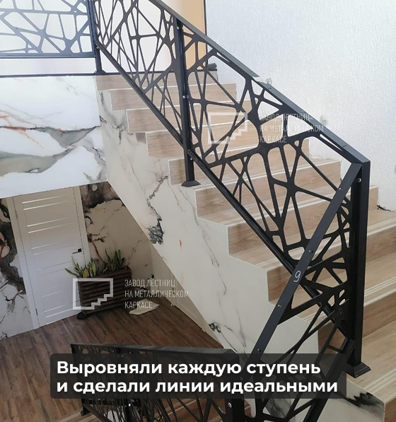 🎨Особое внимание мы уделили ограждению. Мы разработали индивидуальный дизайн — геометричные линии из металла, будто сплетённые вручную. Они задают ритм и отлично сочетаются с активным рисунком мрамора. Это не просто перила, а полноценный визуальный акцент.