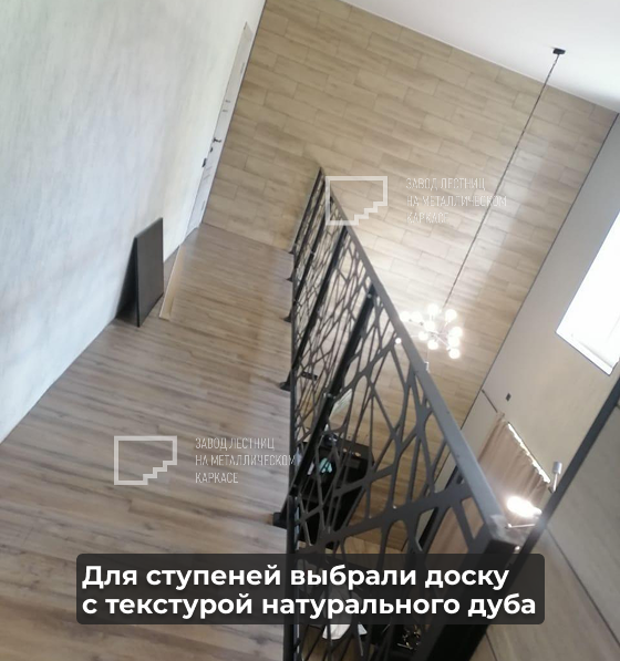 🌳Для ступеней выбрали инженерную доску с текстурой натурального дуба. Тёплый цвет древесины стал уравновешивающим элементом между чёрным металлом и холодным оттенком камня.