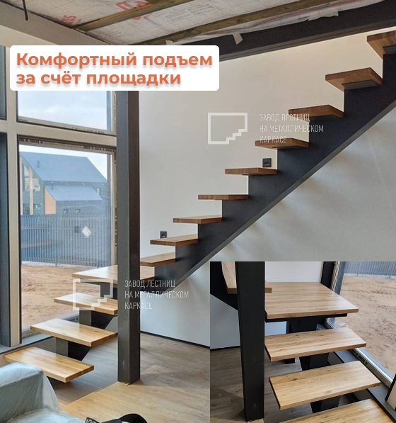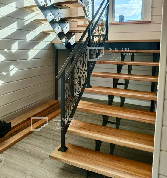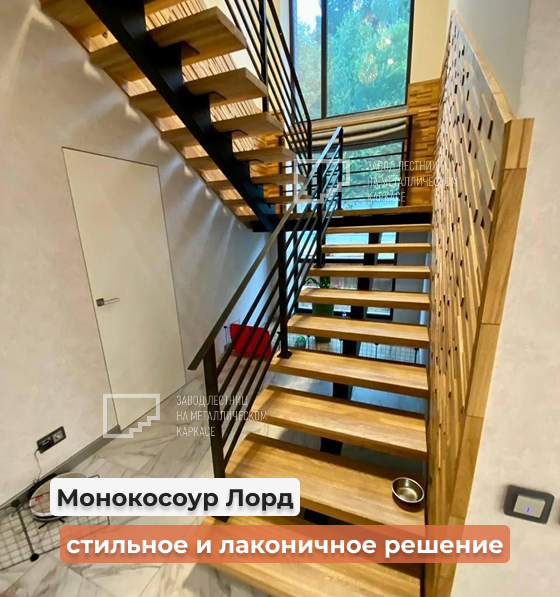 Мы предложили оптимальное и проверенное временем решение — лестницу на монокосоуре «Лорд». Эта модель идеально подходит для узких проёмов и небольших помещений. Косоур изготовлен индивидуально из цельного листа металла, обеспечивающего высокую прочность при визуальной лёгкости конструкции.